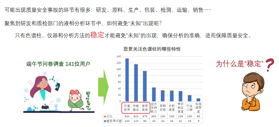 聚焦到研發(fā)和質(zhì)檢部門的液相分析環(huán)節(jié)中,如何避免“未知”出現(xiàn)呢?只有色譜柱、儀器和分析方法的穩(wěn)定才能避免“未知”的出現(xiàn),確保分析的準(zhǔn)確,進(jìn)而保障質(zhì)量安全。